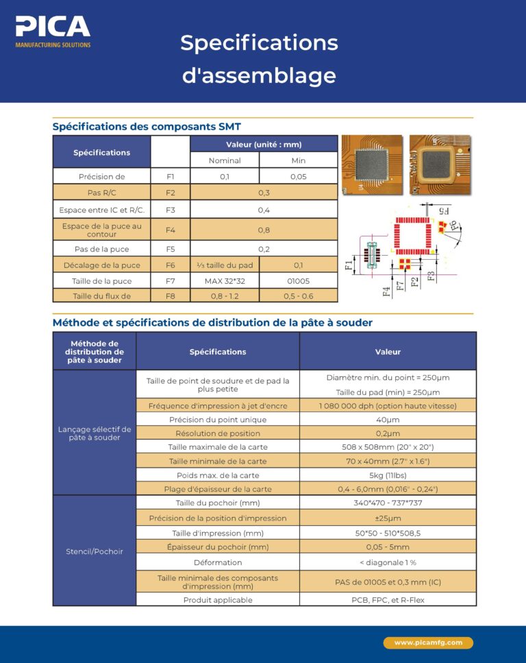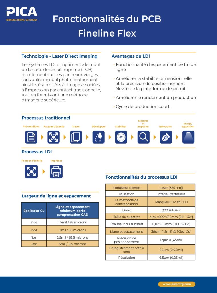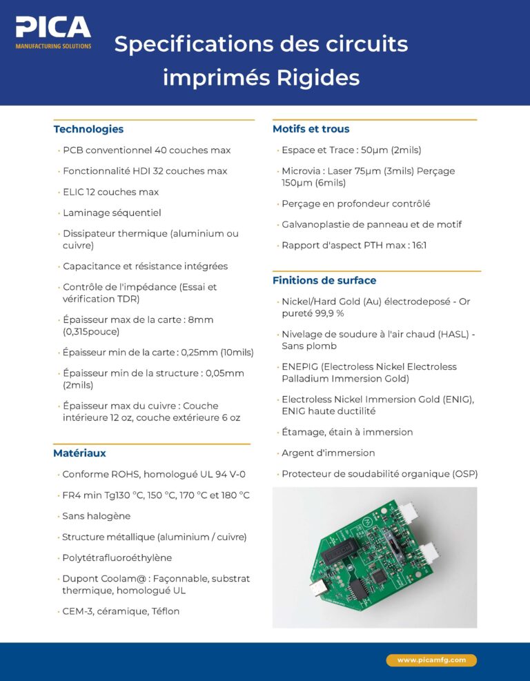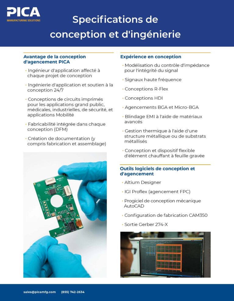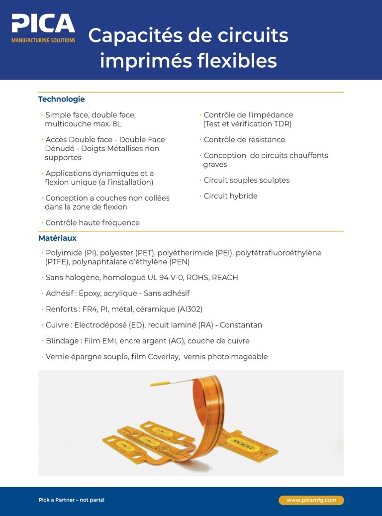 Explorez nos fiches de capacités téléchargeables pour découvrir des informations détaillées sur nos services de conception, d’ingénierie et de fabrication. Que vous recherchiez des informations sur les options de matériaux, les conceptions de flex dynamique ou l’assemblage de précision, nous mettons à votre disposition les ressources nécessaires pour atteindre vos objectifs en toute confiance. Faites de PICA votre partenaire de confiance pour construire l’avenir de l’électronique.