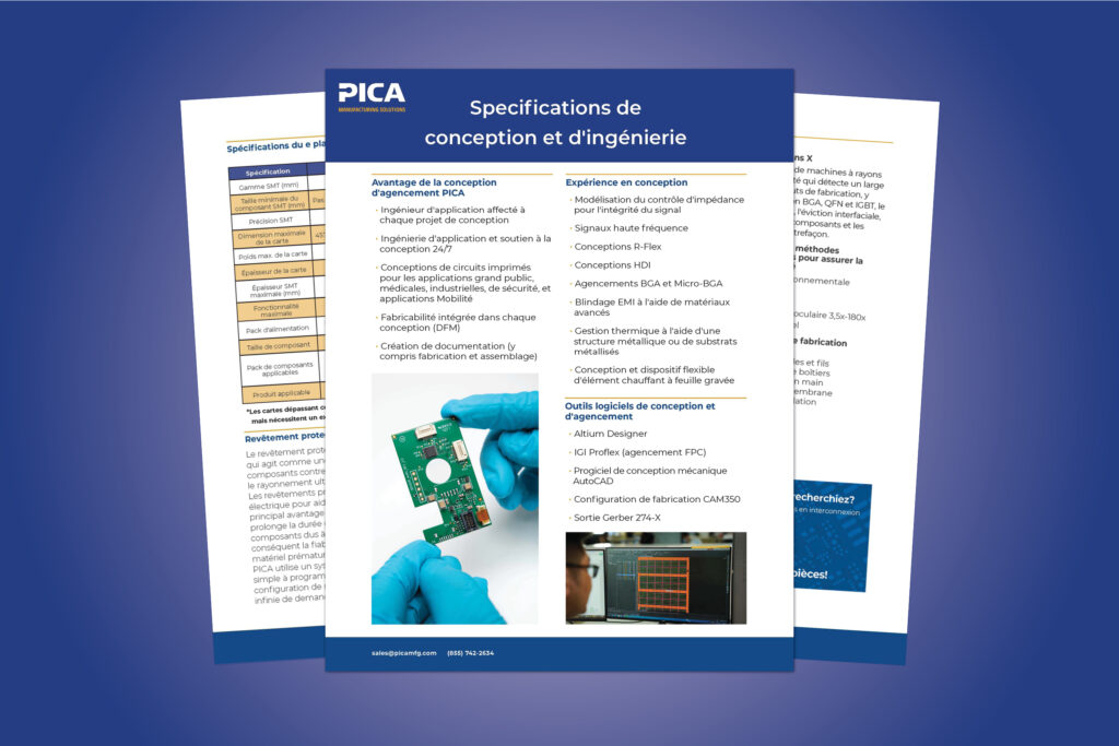 Chez PICA Manufacturing Solutions, nos capacités de conception et d’ingénierie constituent le socle de solutions PCB innovantes et à hautes performances. De l’électronique grand public aux dispositifs médicaux, en passant par les systèmes industriels et les technologies portables, notre expertise couvre un large éventail d’applications. Nous proposons un support en ingénierie d’application et en conception 24h/24 et 7j/7, garantissant des solutions sur mesure et une fabricabilité intégrée à chaque conception.