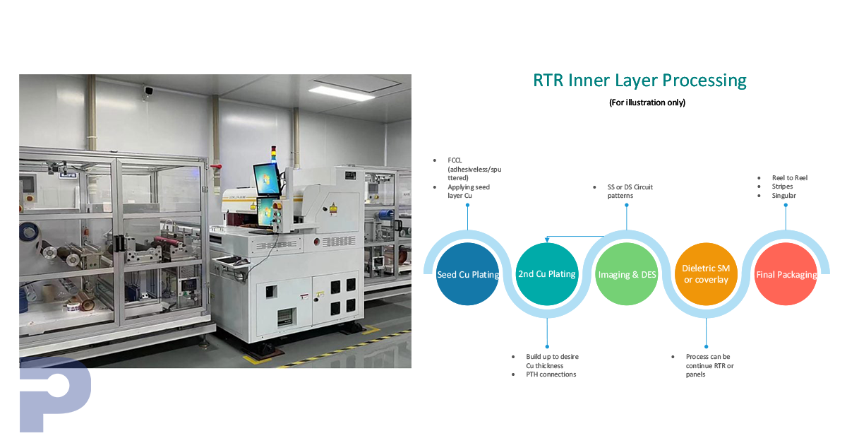 RTR requires specialized lines and is typically limited to 250 mm web widths and 100m long roll. There are customs-built lines that can do up to 500mm web width but rare as the dimension stability control will be challenging. Most panels processing manufacturers are now converting their inner layer processing into RTR for better yield control. Some designs may need rethinking from panel-based layouts, and certain finishes are still better suited for panel processing. Even so, for high-density and high-volume flexible circuits, the efficiency gains outweigh these limitations.